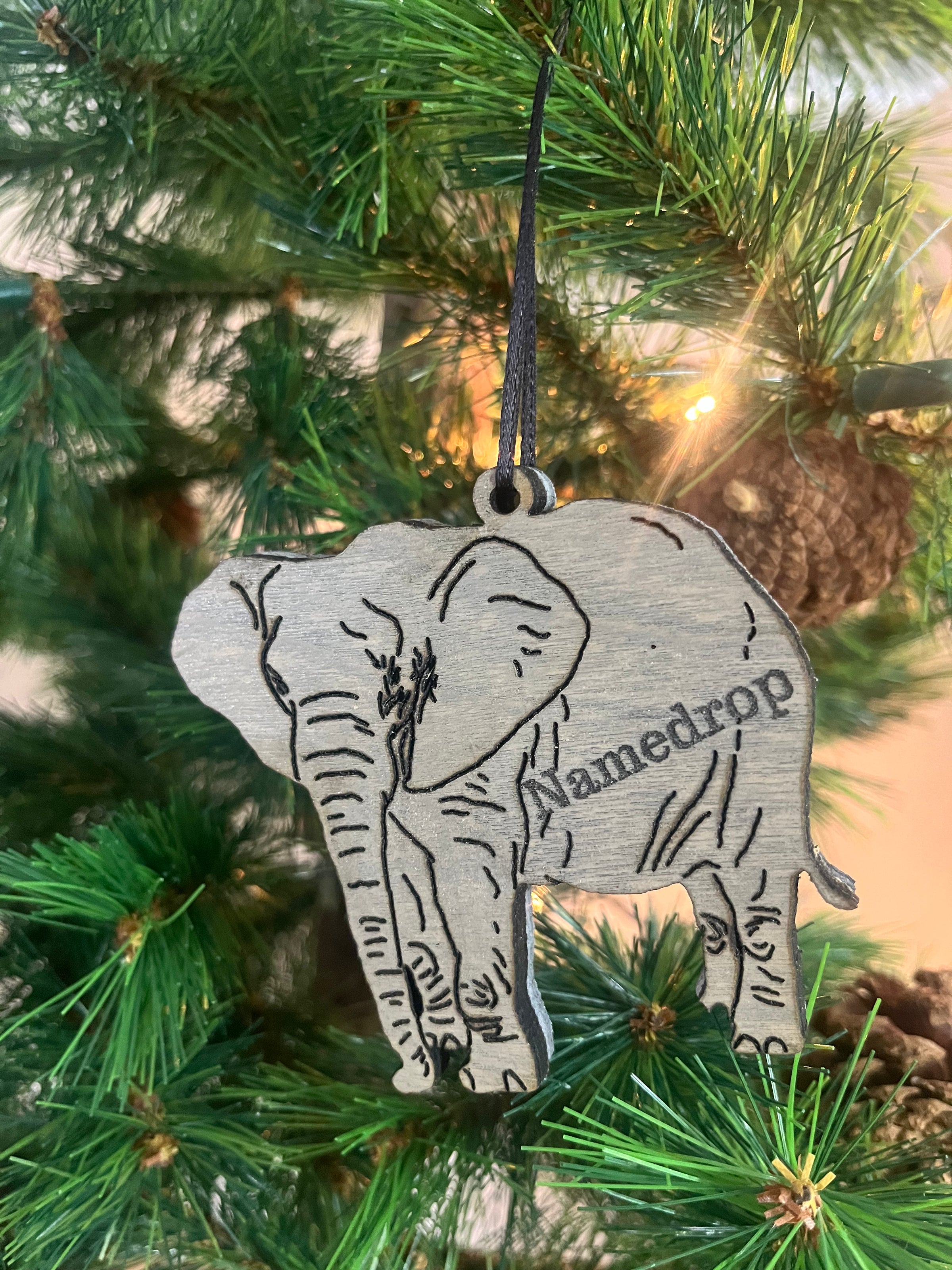 The Elephant ornament is made of wood and comes with ribbon for easy hanging. The ornament can be customized with your city, town, village, lake, river, a fun saying, a person's name or anything else you can think of or just leave it blank!