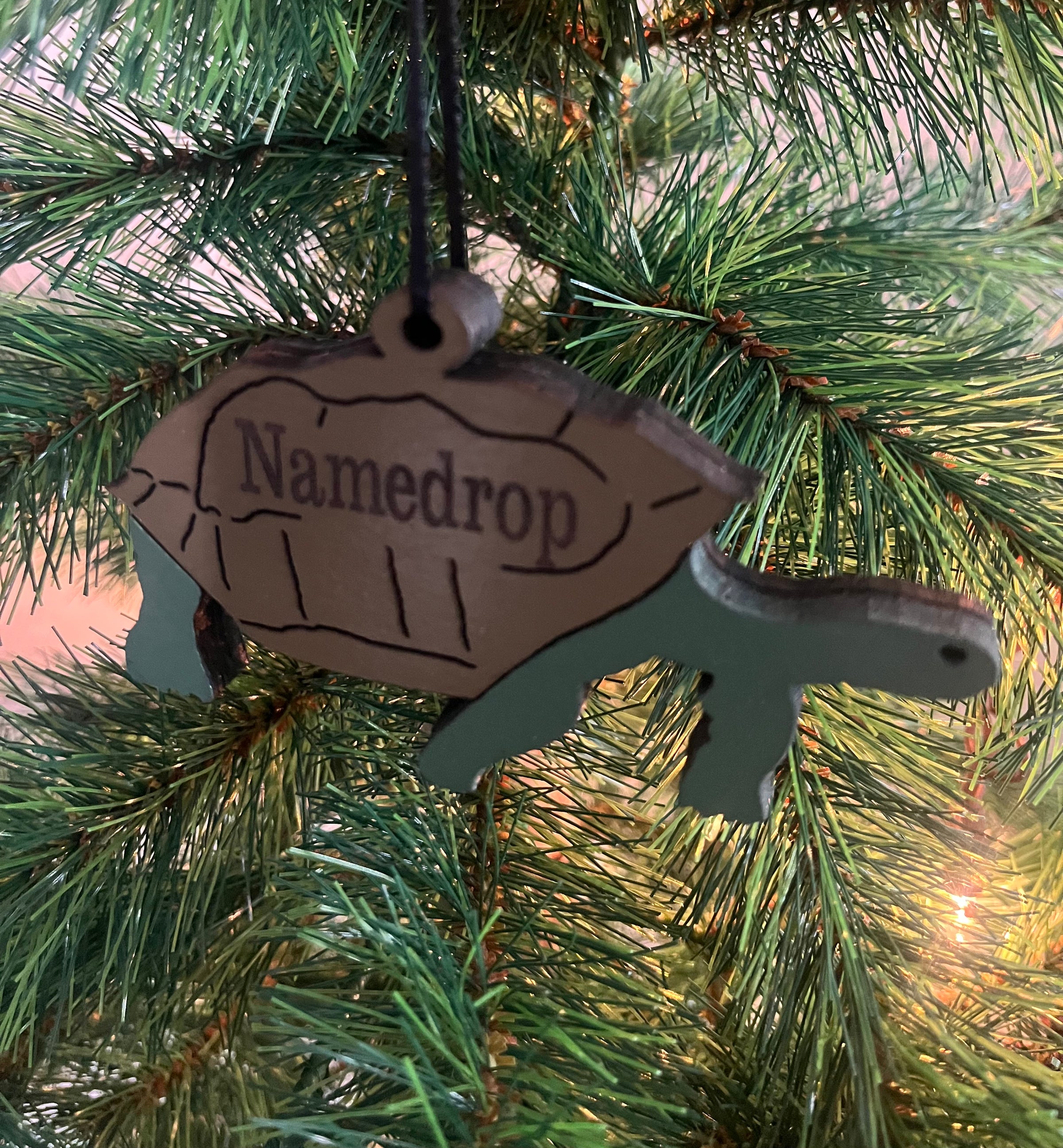 The Turtle ornament is made of wood and comes with ribbon for easy hanging. The ornament can be customized with your city, town, village, lake, river, a fun saying, a person's name or anything else you can think of or just leave it blank!